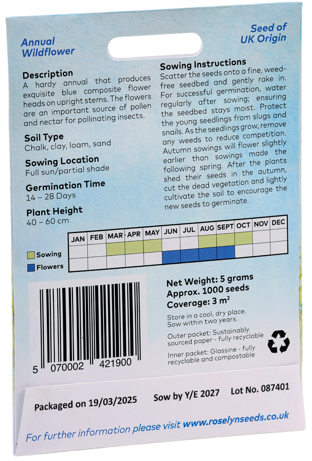 This native annual British wildflower is distinctive due to its star-like bright blue flowers. It is easy to grow and suits most gardens. It attracts many pollinators including bees and butterflies. The seeds are of British origin.