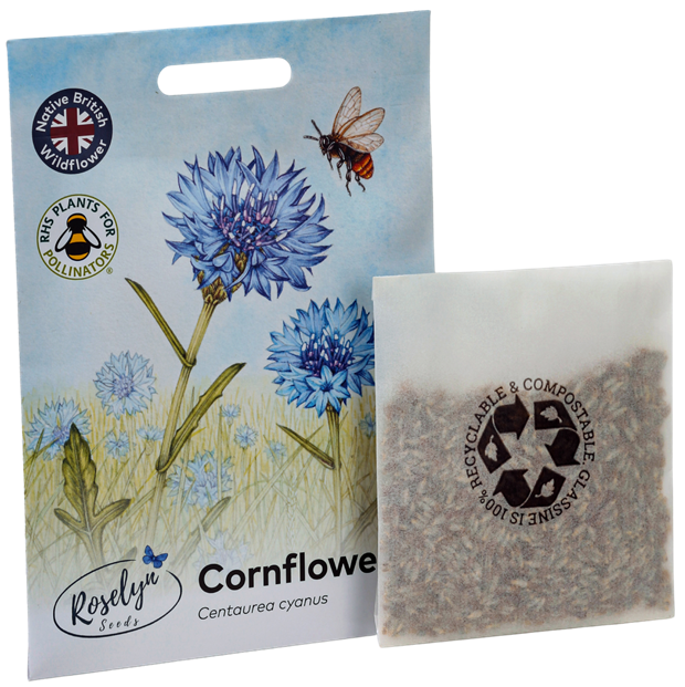 Cornflower seed packet alongside the compostable glassine insert which contains the seeds.